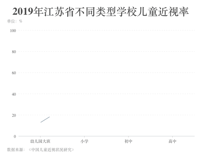 ????? 中國兒童近視率隨年齡的增長呈現(xiàn)上升趨勢。以江蘇省2019年的調(diào)查結(jié)果為例,該省幼兒園大班兒童近視率為12.8%,小學(xué)階段增長至38.5%,初中階段增長至80.2%,顯示出近視率在小學(xué)和初中階段增長速度較快,說明低年齡階段是近視防控的重點階段。