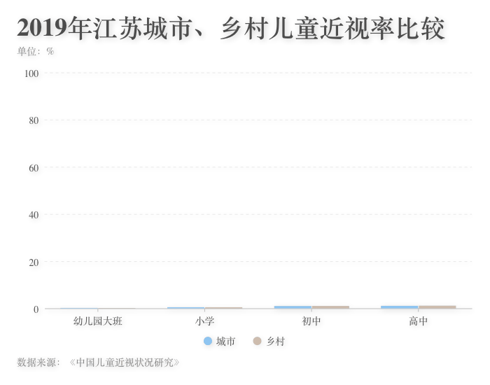 ????? 調(diào)查顯示,中國城市地區(qū)的兒童總體近視率約為48.8%,顯著高于鄉(xiāng)村地區(qū)兒童的近視率(31.9%)。但是在不同階段尤其在中學(xué)階段,有調(diào)查結(jié)果顯示鄉(xiāng)村兒童近視率反超城市兒童。以江蘇省為例,該地區(qū)幼兒園大班和小學(xué)階段城市兒童近視率高于鄉(xiāng)村兒童,初中和高中階段城市兒童近視率低于鄉(xiāng)村兒童,顯示出鄉(xiāng)村兒童在小學(xué)至初中階段近視增長率高于城市兒童,需要重點防控。