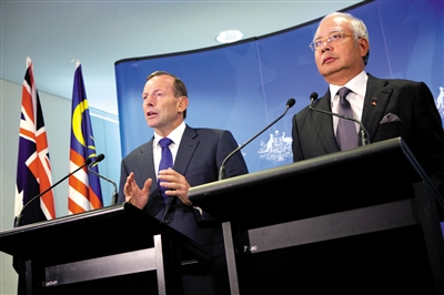 發(fā)布會(huì)持續(xù)了10分25秒,澳大利亞總理阿博特和馬來西亞總理納吉布先后發(fā)言。雙方總理確認(rèn),澳大利亞正式成為馬航搜尋的主導(dǎo)國,并開始參與調(diào)查。