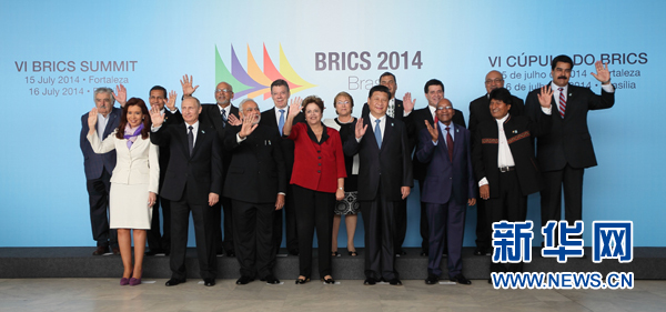 ????新華網(wǎng)巴西利亞7月16日電(記者陳威華、錢(qián)彤)7月16日,金磚國(guó)家同南美國(guó)家領(lǐng)導(dǎo)人對(duì)話會(huì)在巴西利亞舉行。中國(guó)國(guó)家主席習(xí)近平、巴西總統(tǒng)羅塞夫、俄羅斯總統(tǒng)普京、印度總理莫迪、南非總統(tǒng)祖馬以及蘇里南總統(tǒng)鮑特塞、阿根廷總統(tǒng)克里斯蒂娜、玻利維亞總統(tǒng)莫拉萊斯、哥倫比亞總統(tǒng)桑托斯、智利總統(tǒng)巴切萊特、厄瓜多爾總統(tǒng)科雷亞、圭亞那總統(tǒng)拉莫塔爾、巴拉圭總統(tǒng)卡特斯、秘魯總統(tǒng)烏馬拉、烏拉圭總統(tǒng)穆??ā⑽瘍?nèi)瑞拉總統(tǒng)馬杜羅等南美國(guó)家領(lǐng)導(dǎo)人共同出席。