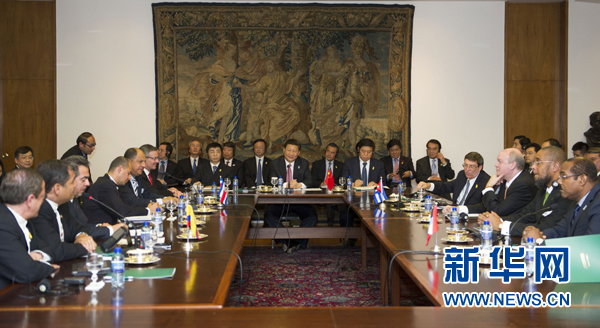 ??? 當(dāng)?shù)貢r(shí)間7月17日,國(guó)家主席習(xí)近平在巴西利亞會(huì)見(jiàn)拉美和加勒比國(guó)家共同體輪值主席國(guó)哥斯達(dá)黎加總統(tǒng)索利斯、前任輪值主席國(guó)古巴國(guó)務(wù)委員會(huì)主席兼部長(zhǎng)會(huì)議主席勞爾·卡斯特羅、候任輪值主席國(guó)厄瓜多爾總統(tǒng)科雷亞、加勒比共同體輪值主席國(guó)安提瓜和巴布達(dá)總理布朗。新華社記者 謝環(huán)馳 攝