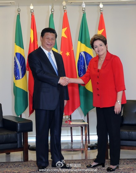 ??? 據(jù)新華社“新國際”微博報道,習近平17日與巴西總統(tǒng)羅塞夫會談時表示,中巴政治和戰(zhàn)略互信達到前所未有的高水平,利益聯(lián)系達到前所未有的緊密程度,兩國已經(jīng)成為命運共同體。雙方應該加強交流合作,共同維護發(fā)展中國家共同利益,推動國際力量對比朝著更加均衡方向發(fā)展。(蘭紅光攝)