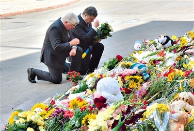 21日,基輔,烏克蘭總統(tǒng)波羅申科在荷蘭駐烏克蘭使館外敬獻鮮花。