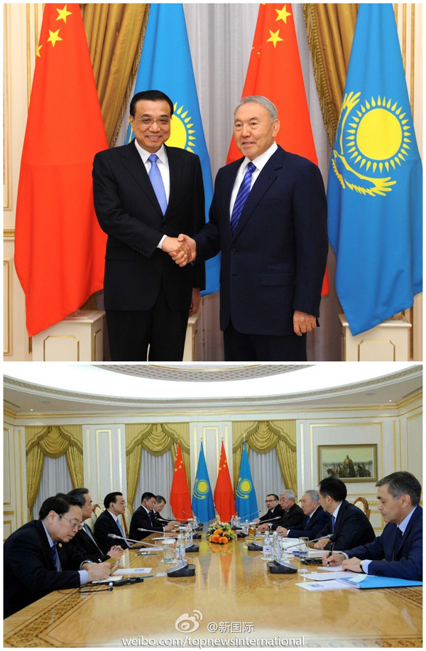 ????新華網(wǎng)北京12月15日電? 據(jù)新華社“新國際”微博報(bào)道,哈薩克斯坦總統(tǒng)納扎爾巴耶夫一般不在周末會(huì)客??墒菫榱藲g迎遠(yuǎn)道而來的中國總理,他打破了自己的慣例,于當(dāng)?shù)貢r(shí)間14日(周日)下午5點(diǎn),在阿斯塔納總統(tǒng)府三層金廳高規(guī)格接待了首次訪哈的李克強(qiáng)總理,兩人同聲傳譯足足談了一個(gè)半小時(shí)。