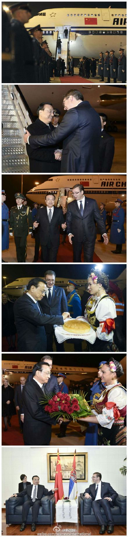 ??? 新華網北京12月16日電 據(jù)新華社“新國際”微博報道,當?shù)貢r間15日晚,李克強總理乘專機抵達塞爾維亞首都貝爾格萊德,出席中國-中東歐領導人會晤并正式訪塞,塞總理武契奇率兩位副總理及多位部長到機場迎接,塞女青年按照迎接貴賓的傳統(tǒng)禮儀獻上面包和鹽請他品嘗。兩國總理在機場進行了親切會見。