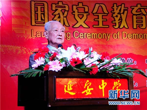 ????5月12日,中國政策科學研究會國家安全政策委員會副會長、軍事科學院原副院長糜振玉,在延安中學“國家安全教育示范基地”啟動儀式上致辭。(新華網(wǎng)記者 郝斐然 攝)