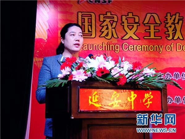 ????延安市副市長趙璟在延安中學“國家安全教育示范基地”啟動儀式上致辭。(新華網(wǎng)記者 郝斐然 攝)