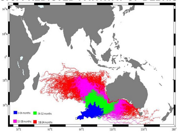 ?。ㄎ靼拇罄麃喆髮W(xué)研究人員繪制的殘骸可能漂流路徑圖,紅色為18-24個(gè)月可能出現(xiàn)殘骸的區(qū)域,粉色為12到18個(gè)月,綠色為6到12個(gè)月,藍(lán)色為六個(gè)月之內(nèi)。)