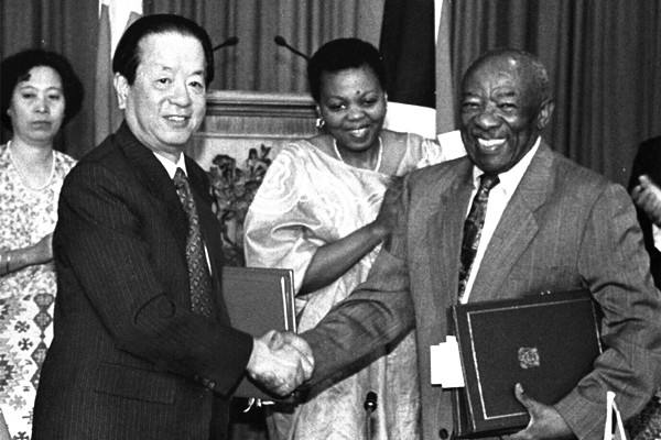 1997年12月30日,中國與南非簽署建交聯(lián)合公報。圖為錢其琛與恩佐交換文本后握手。(新華社記者李學(xué)仁攝)