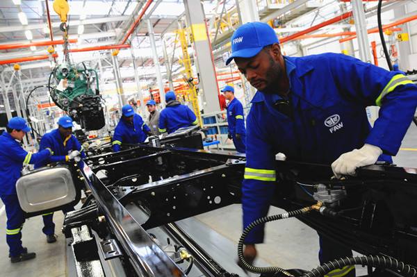 2014年7月10日,中國第一汽車集團(tuán)在南非東開普省曼德拉灣市舉行南非庫哈工廠落成及首輛機(jī)車下線儀式。圖為工人在中國一汽南非工廠生產(chǎn)線上工作。 (新華社記者張川石攝)