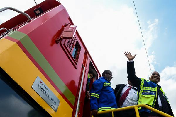 2015年3月19日,南非總統(tǒng)祖馬(右)從“曼德拉一型” 第95臺電力機(jī)車上走下來時向大家揮手致意。(新華社記者翟健嵐攝)