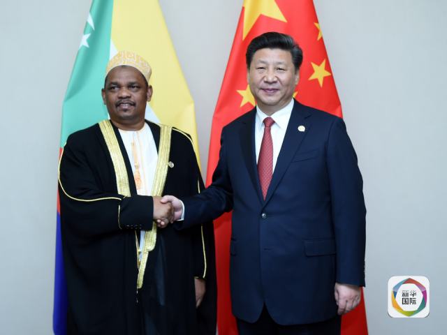 12月4日,國家主席習近平在約翰內斯堡會見科摩羅總統(tǒng)伊基利盧。(新華社記者張鐸攝)