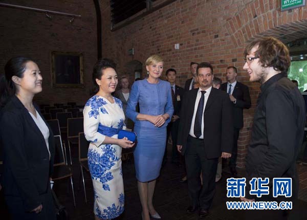 當(dāng)?shù)貢r(shí)間6月20日上午,國(guó)家主席習(xí)近平夫人彭麗媛同波蘭總統(tǒng)杜達(dá)夫人阿加塔在華沙共同參觀肖邦博物館。這是彭麗媛與波蘭青年鋼琴演奏家親切交談。新華社記者謝環(huán)馳攝