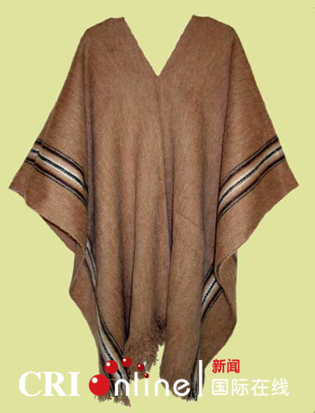 ????彭丘是用羊駝毛織成的披風,面料質(zhì)地十分細膩,胸口開V字領(lǐng),形狀像長方形的毛毯,兩側(cè)的擺有黑白相間的傳統(tǒng)花邊。顏色采取深棕色,披在身上呈寬松的倒三角廓形,傳統(tǒng)花邊的點綴極具地域特色。