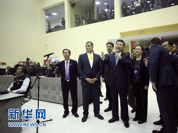 習(xí)近平抵達(dá)公共安全應(yīng)急指揮中心時,科雷亞在門口迎接。兩國元首共同參觀中方支援厄瓜多爾抗震救災(zāi)圖片展,并為厄瓜多爾公共安全應(yīng)急指揮中心聯(lián)合實驗室揭牌。兩國元首觀看介紹喬內(nèi)醫(yī)院和辛克雷水電站的視頻,并同項目現(xiàn)場人員連線互動。喬內(nèi)醫(yī)院現(xiàn)場中方負(fù)責(zé)人向兩國元首報告醫(yī)院工程正式開工。在辛克雷水電站,專程前往現(xiàn)場的厄瓜多爾副總統(tǒng)格拉斯介紹項目完成情況。兩國元首共同按動按鈕,辛克雷水電站正式竣工發(fā)電。