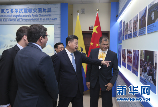 當(dāng)?shù)貢r間11月18日,國家主席習(xí)近平在基多同厄瓜多爾總統(tǒng)科雷亞共同出席中方援建的厄瓜多爾公共安全應(yīng)急指揮中心聯(lián)合實驗室揭牌儀式,喬內(nèi)醫(yī)院奠基、科卡科多-辛克雷水電站竣工發(fā)電視頻連線活動。這是兩國元首共同參觀中方支援厄瓜多爾抗震救災(zāi)圖片展。新華社記者 蘭紅光 攝
