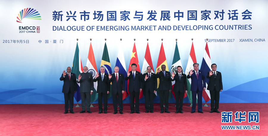 9月5日,國(guó)家主席習(xí)近平在廈門(mén)國(guó)際會(huì)議中心主持新興市場(chǎng)國(guó)家與發(fā)展中國(guó)家對(duì)話會(huì)并發(fā)表重要講話。金磚國(guó)家領(lǐng)導(dǎo)人巴西總統(tǒng)特梅爾、俄羅斯總統(tǒng)普京、印度總理莫迪、南非總統(tǒng)祖馬和對(duì)話會(huì)受邀國(guó)領(lǐng)導(dǎo)人埃及總統(tǒng)塞西、幾內(nèi)亞總統(tǒng)孔戴、墨西哥總統(tǒng)培尼亞、塔吉克斯坦總統(tǒng)拉赫蒙、泰國(guó)總理巴育出席對(duì)話會(huì)。這是對(duì)話會(huì)前,習(xí)近平同出席對(duì)話會(huì)的各國(guó)領(lǐng)導(dǎo)人集體合影。