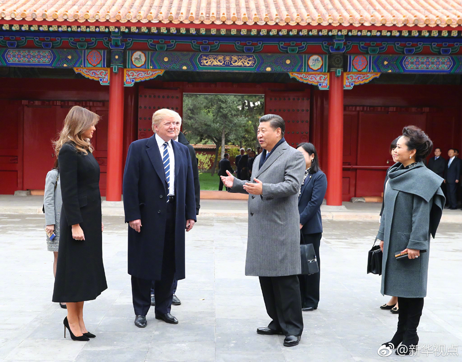 新華網(wǎng)北京11月8日電 國(guó)家主席習(xí)近平和夫人彭麗媛8日下午在故宮博物院迎接來(lái)華進(jìn)行國(guó)事訪(fǎng)問(wèn)的美國(guó)總統(tǒng)特朗普和夫人梅拉尼婭。兩國(guó)元首夫婦在寶蘊(yùn)樓簡(jiǎn)短茶敘。