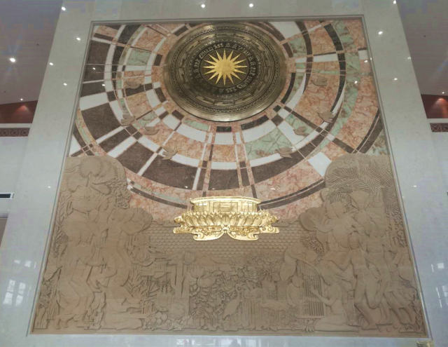 剛剛竣工的越中友誼宮,即將迎來一場(chǎng)盛大的落成移交儀式。記者抵達(dá)時(shí),花匠們正在門口精心布置,用鮮花擺出中國(guó)和越南國(guó)旗的式樣。步入大廳,由中央美術(shù)學(xué)院歷時(shí)七個(gè)月設(shè)計(jì)的大型壁畫《山水相依 友誼長(zhǎng)存》撲入眼簾——核心元素是中越古代共有的樂器“銅鼓”,寓意兩國(guó)文化交融源遠(yuǎn)流長(zhǎng)。畫面中下部是身著傳統(tǒng)服飾的中越民眾形象,或翩翩起舞,或引吭高歌,或手捧豐收果實(shí),喜樂祥和中傳遞著中越之間濃厚的情誼。