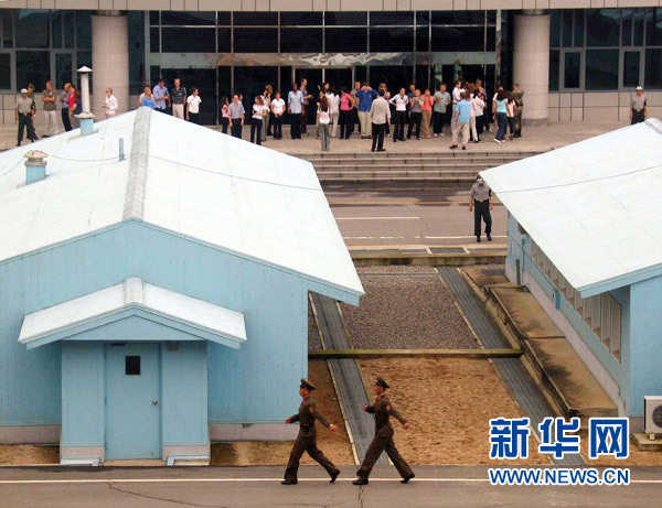 2004年7月26日拍攝的資料照片顯示,來(lái)自世界各國(guó)的游客在板門(mén)店韓國(guó)一側(cè)(上)參觀,畫(huà)面下部為板門(mén)店朝鮮一側(cè)兩名正在執(zhí)勤的朝鮮人民軍士兵。新華社記者姬新龍攝