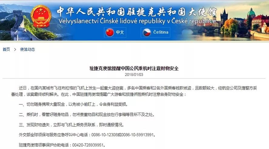 中國駐捷克使館提醒廣大游客和旅捷僑胞乘機(jī)時注意自身財物安全: