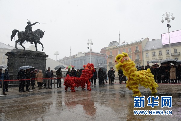 當(dāng)?shù)貢r(shí)間12日中午,來自斯洛伐克中國武術(shù)協(xié)會(huì)的舞獅表演隊(duì)冒雪表演傳統(tǒng)舞獅節(jié)目,中國駐克羅地亞大使胡兆明和薩格勒布市長米蘭·班迪奇為舞獅點(diǎn)睛,熱鬧的鑼鼓和一紅一黃兩頭“獅子”吸引了大批市民駐足觀看。