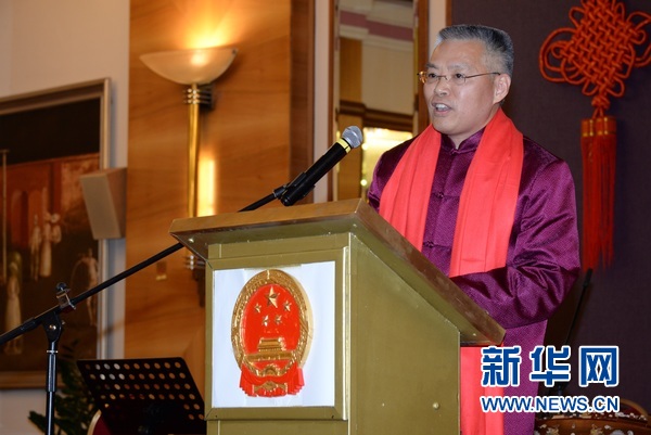 2月12日,中國駐克羅地亞大使胡兆明在薩格勒布出席中國春節(jié)慶祝晚會(huì)時(shí)致辭。新華網(wǎng)發(fā)(高磊攝)