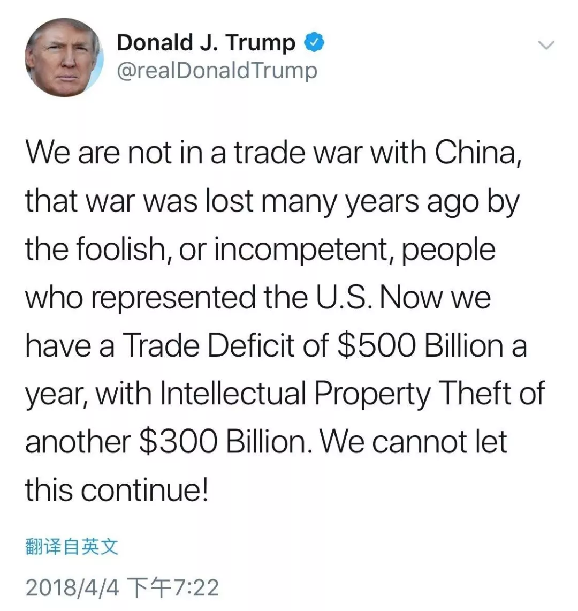 昨天,特朗普發(fā)了他“貿(mào)易戰(zhàn)”之后的首條推特……