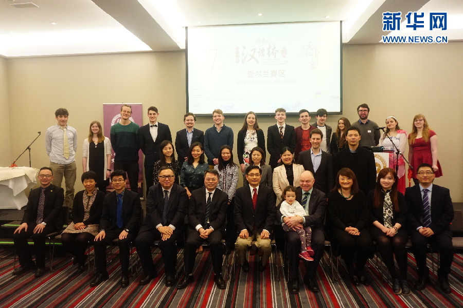 嘉賓和評(píng)委與參賽選手合影。4月7日,第17屆“漢語(yǔ)橋”世界大學(xué)生中文比賽愛(ài)爾蘭賽區(qū)選拔賽在首都都柏林舉行。新華網(wǎng)發(fā)