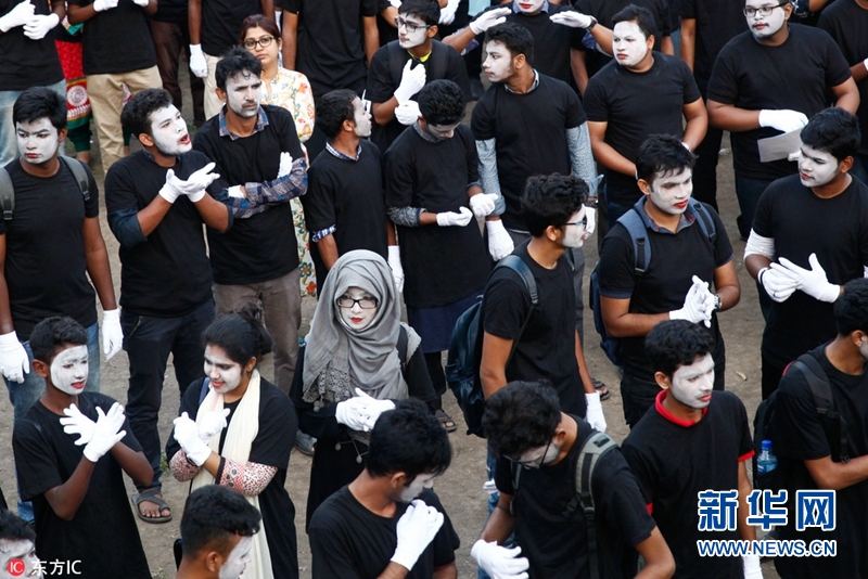 當(dāng)?shù)貢r間2018年4月8日,孟加拉國達(dá)卡,2018年國際啞劇節(jié)在達(dá)卡開幕,超過254名啞劇演員齊聚達(dá)卡大學(xué)參加表演,成為全世界啞劇演員最多的表演節(jié)目,破吉尼斯世界紀(jì)錄。(圖片來源:東方IC)