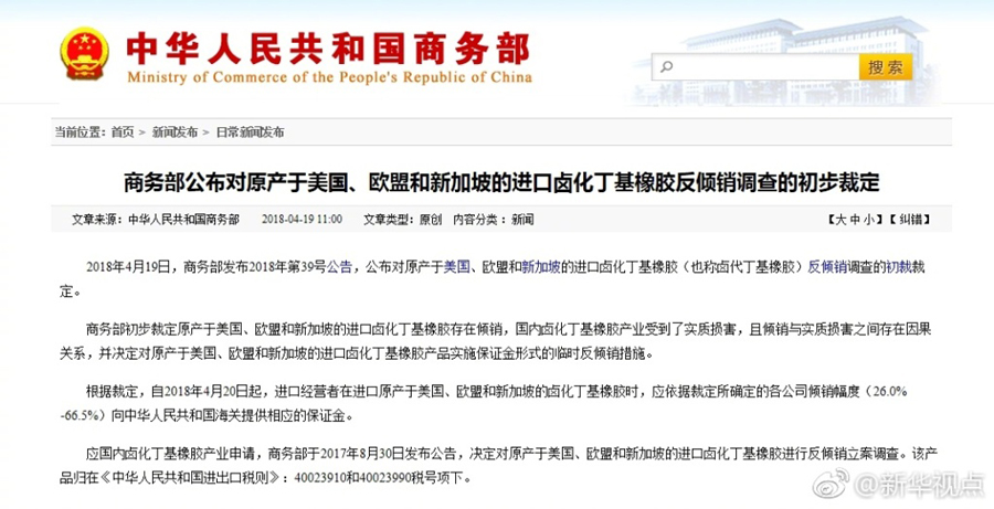 新華網(wǎng)北京4月19日電 商務(wù)部今天發(fā)布公告,初步裁定原產(chǎn)于美國、歐盟和新加坡的進口鹵化丁基橡膠存在傾銷。根據(jù)裁定,自2018年4月20日起,進口經(jīng)營者在進口原產(chǎn)于美國、歐盟和新加坡的鹵化丁基橡膠時,應(yīng)依據(jù)裁定所確定的各公司傾銷幅度(26.0%-66.5%)向中華人民共和國海關(guān)提供相應(yīng)的保證金。?(據(jù)新華社“新華視點”微博報道)
