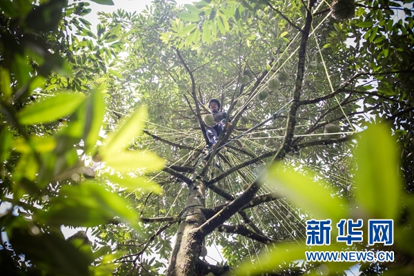 泰國莊他武里府果園中,工人在清晨爬上榴蓮樹采摘榴蓮。新華網(wǎng)發(fā) (阿里巴巴提供)