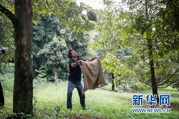 泰國莊他武里府果園中,一個工人在樹下以麻袋接住摘下的榴蓮。新華網(wǎng)發(fā) (阿里巴巴提供)