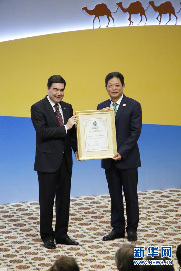 論壇開幕式上,絲綢之路國際總商會(huì)主席呂建中代表該商會(huì)向別爾德穆哈梅多夫頒發(fā)“復(fù)興絲綢之路榮譽(yù)證書”。新華社記者 周良攝