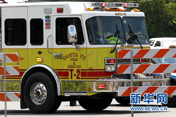 5月18日,在美國(guó)得克薩斯州加爾維斯頓郡圣菲市,一輛消防救援車(chē)在發(fā)生槍擊的圣菲高中附近待命。新華社發(fā)(宋穹 攝)