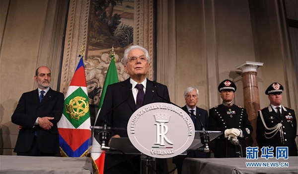 5月27日,在意大利首都羅馬,意總統(tǒng)馬塔雷拉發(fā)表講話。據(jù)當?shù)孛襟w報道,意大利新任總理孔特27日晚間與總統(tǒng)馬塔雷拉會面并提交擬定的內(nèi)閣成員名單時,馬塔雷拉否決了由意大利聯(lián)盟黨和五星運動力推的持疑歐立場的經(jīng)濟學(xué)家保羅·薩沃納出任財政部長??滋叵蚩偨y(tǒng)提出放棄組閣任務(wù)請求,請求得到總統(tǒng)確認。新華社發(fā)(阿爾貝托·林格里亞攝)