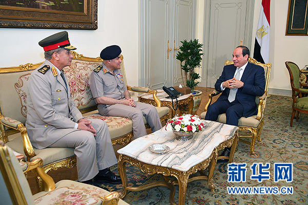 6月14日,在埃及首都開(kāi)羅,埃及總統(tǒng)塞西(右一)和本屆內(nèi)閣新當(dāng)選成員國(guó)防部長(zhǎng)穆罕默德·扎基(左一)和前任國(guó)防部長(zhǎng)西德基·蘇卜希(左二)交談。新華社/中東社