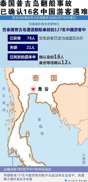 新華社泰國普吉7月6日電(記者顏昊 楊舟)據(jù)中國駐泰國宋卡總領事館6日通報,根據(jù)最新搜救進展情況,在泰國普吉島遭遇翻船事故的127名中國游客中,已有78人獲救,確認16人遇難。