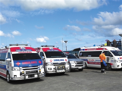 7月6日,泰國普吉島查龍碼頭,救援車輛??吭诖a頭等待。 通訊員 卜志輝 攝