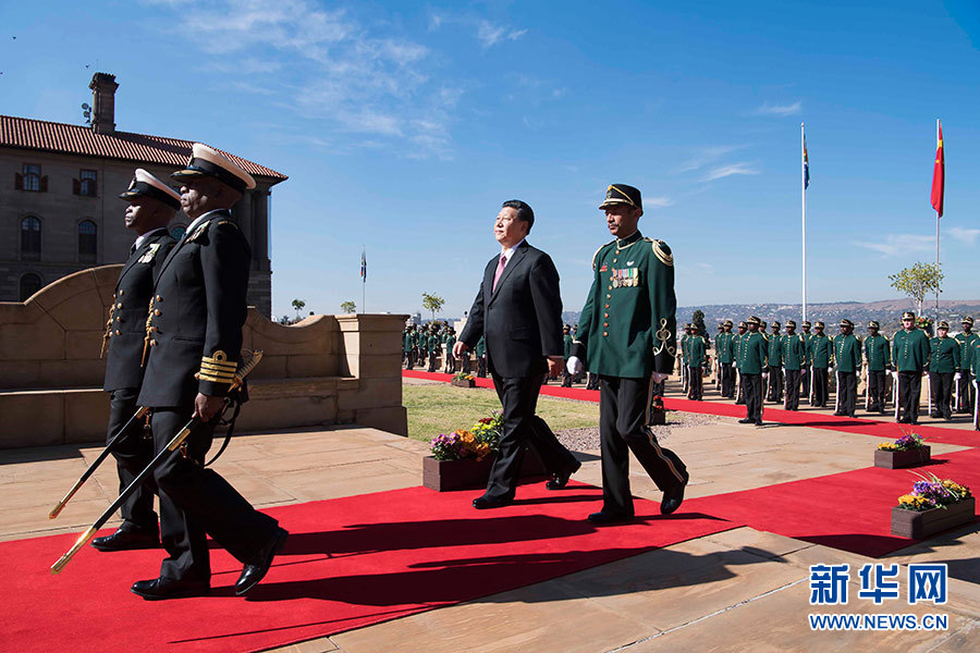 總統(tǒng)府前廣場(chǎng),微風(fēng)拂面,陽光和煦。中南兩國國旗迎風(fēng)飄揚(yáng)。習(xí)近平和夫人彭麗媛受到拉馬福薩和夫人莫采佩熱情迎接。兩國元首夫婦登上檢閱臺(tái)。儀仗隊(duì)行持槍禮。軍樂隊(duì)奏中國國歌。現(xiàn)場(chǎng)鳴放21響禮炮。習(xí)近平檢閱儀仗隊(duì)。軍樂隊(duì)奏南非國歌。習(xí)近平和彭麗媛同南方主要官員握手。拉馬福薩夫婦同中方陪同人員握手。兩國元首夫婦親切寒暄。拉馬福薩對(duì)習(xí)近平在南中建交20周年之際訪問南非并出席金磚國家領(lǐng)導(dǎo)人會(huì)晤表示熱烈歡迎。