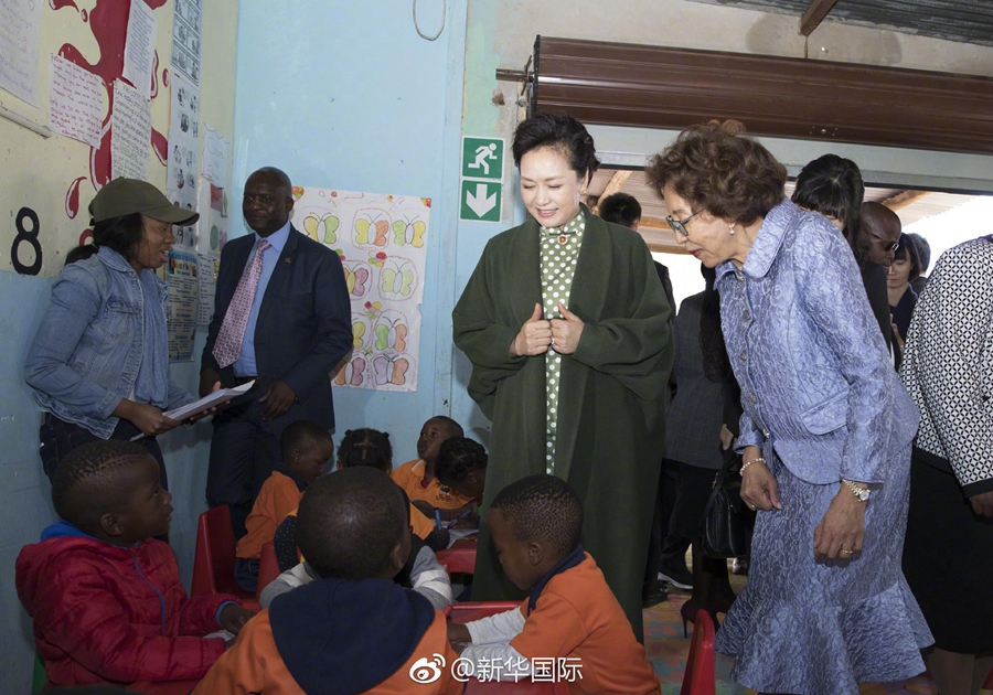 彭麗媛和莫采佩抵達(dá)時,非洲自助基金會負(fù)責(zé)人、托兒所園長等在門口迎接。40名活潑可愛的南非兒童揮舞中南兩國國旗列隊歡迎,彭麗媛俯身同孩子們親切握手問候。彭麗媛來到庭院,20多名兒童手持兩國國旗,輪流用中英文高聲呼喊“歡迎歡迎”。孩子們伴著俏皮輕快的舞蹈動作,合唱英文歌曲《歡迎您》、用中文吟唱中國古詩兒歌《詠鵝》、演唱南非說唱歌曲。彭麗媛認(rèn)真聆聽,頻頻點頭微笑、不時鼓掌稱贊,夸獎孩子們中文發(fā)音準(zhǔn)確。彭麗媛來到教室,觀看兒童繪畫、識字,和孩子們用當(dāng)?shù)貍鹘y(tǒng)手語互致問候。彭麗媛向孩子們贈送玩具、文具、圖書,并在孩子們自己創(chuàng)作的手印畫上題寫“前程似錦”,勉勵孩子們好好學(xué)習(xí)、茁壯成長。彭麗媛表示,兒童成長關(guān)乎一個國家未來。兒童早期教育,最重要的是樹德育人,引導(dǎo)他們樹立遠(yuǎn)大志向、培育美好心靈。希望中南友好事業(yè)從娃娃抓起,讓他們長大后做兩國友好事業(yè)的傳承者和接班人。