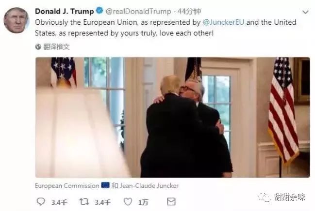 畢竟,到訪美國(guó)的歐盟委員會(huì)主席容克,不僅得到了美國(guó)媒體濃墨重彩的報(bào)道,更在特朗普的推特上,將白宮玫瑰園的浪漫延續(xù)了下去——《經(jīng)濟(jì)學(xué)人》給這次見(jiàn)面取了個(gè)唯美貼切的標(biāo)題:Sealed with a kiss(以吻封緘)。(哈哈哈,莫名覺(jué)得這首歐美經(jīng)典情歌用在這里居然有說(shuō)不出的貼切,《經(jīng)濟(jì)學(xué)人》取標(biāo)題的能力也真是要給個(gè)大寫(xiě)的服字!)