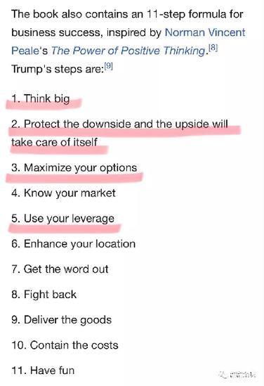 白宮及特朗普近期的表現(xiàn)看似散亂反復(fù),實(shí)際上并非無(wú)跡可循。有個(gè)重要的樣本,就是特朗普本人的作品《交易的藝術(shù)》(The Art of the Deal)。他在書(shū)中回顧自己各種交易經(jīng)歷,總結(jié)出11條重要步驟。