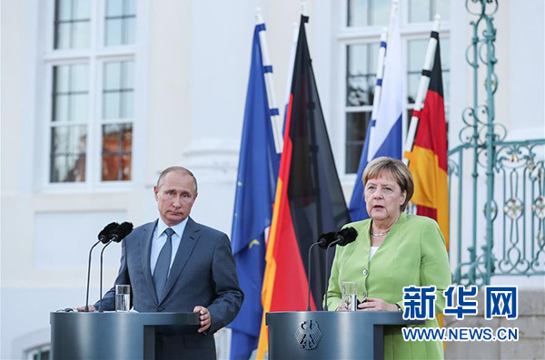 8月18日,在德國首都柏林以北小鎮(zhèn)梅澤貝格,德國總理默克爾(右)與來訪的俄羅斯總統(tǒng)普京共同出席新聞發(fā)布會。當(dāng)日,德國總理默克爾在梅澤貝格與來訪的俄羅斯總統(tǒng)普京舉行會談,雙方就烏克蘭局勢、敘利亞沖突以及“北溪-2”天然氣管道項(xiàng)目等棘手問題進(jìn)行討論。新華社記者 單宇琦攝