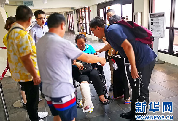 在機(jī)場等候的中國乘客秩序井然,許多人舉著國旗合影,非常興奮。一位在塞班開店的王女士腳部骨折,因當(dāng)?shù)蒯t(yī)療條件有限,她向領(lǐng)館尋求幫助,經(jīng)領(lǐng)館協(xié)調(diào),也順利搭上川航飛機(jī)回國。