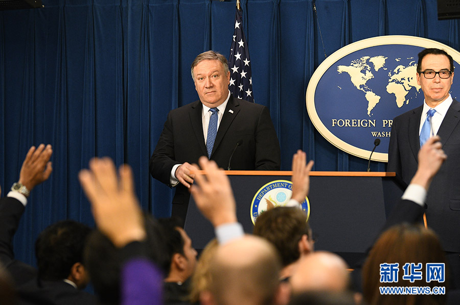 11月5日,在美國首都華盛頓,美國國務卿蓬佩奧(后左)和財政部長姆努欽(后右)出席記者會。 新華社記者劉杰攝