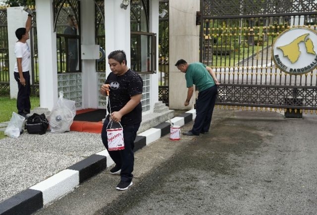 工人沙斯旺(中間)在努洛伊曼王宮大門外粉刷和清洗地面。新華社記者畢曉洋攝