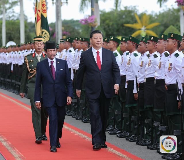 11月19日,國家主席習近平在斯里巴加灣同文萊蘇丹哈桑納爾舉行會談。會談開始前,習近平出席哈桑納爾在王宮前廣場舉行的盛大歡迎儀式。這是在哈桑納爾陪同下,習近平檢閱儀仗隊。新華社記者 鞠鵬 攝