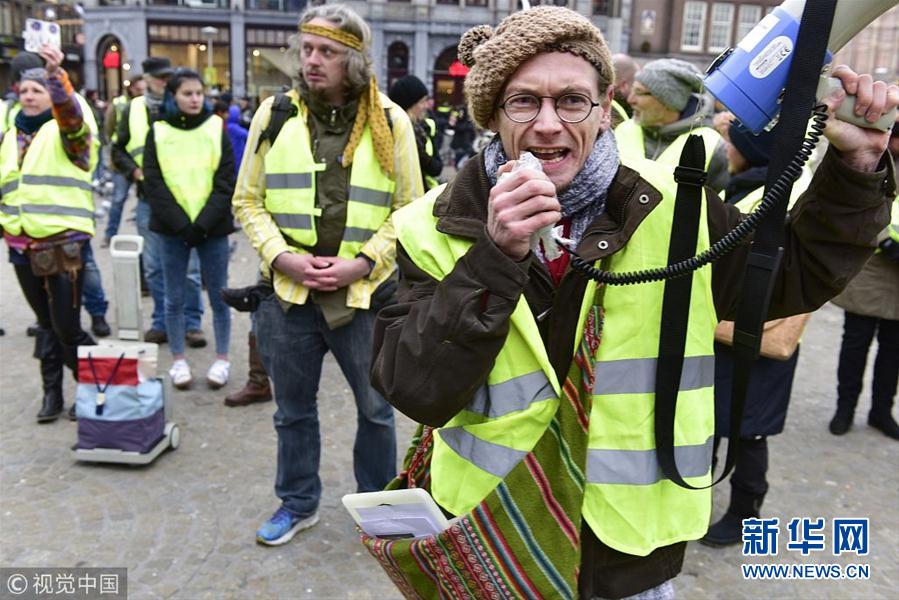 當(dāng)?shù)貢r間12月15日,荷蘭阿姆斯特丹,當(dāng)?shù)乇l(fā)“黃背心”抗議活動。(圖片來源:視覺中國)