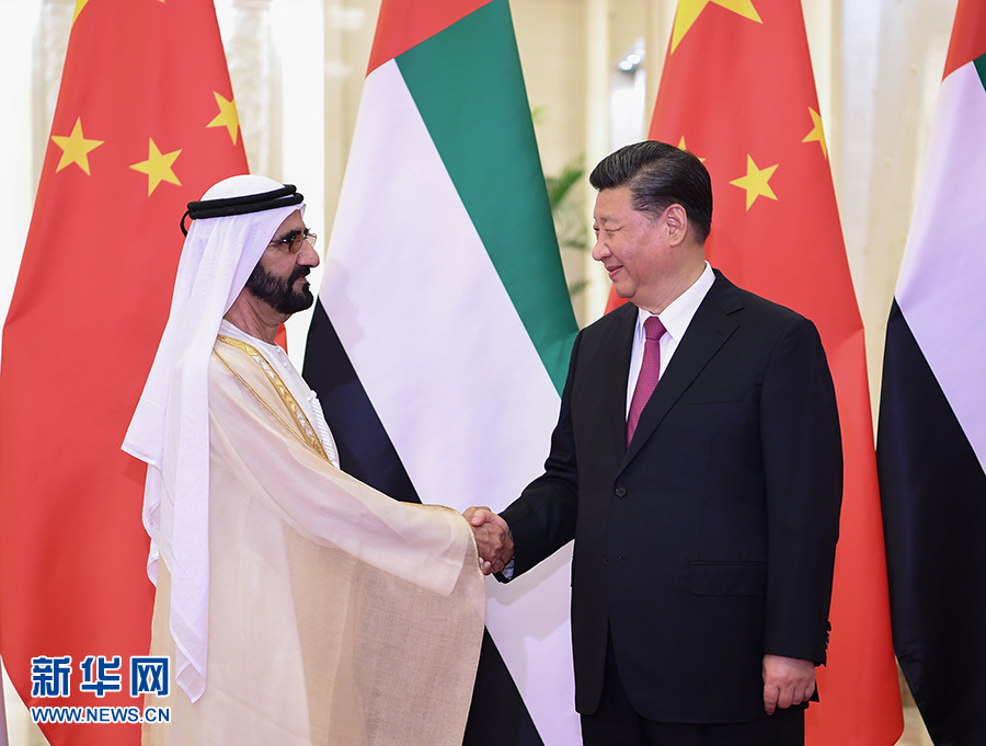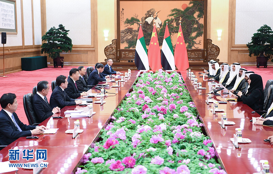 習(xí)近平指出,去年7月我訪問阿聯(lián)酋期間,兩國(guó)宣布建立全面戰(zhàn)略伙伴關(guān)系,揭開中阿關(guān)系發(fā)展新篇章。中方視阿聯(lián)酋為共建“一帶一路”的重要合作伙伴。雙方要穩(wěn)步推進(jìn)以能源合作為主軸、以投資和基礎(chǔ)設(shè)施建設(shè)為兩翼、以高新技術(shù)為增長(zhǎng)點(diǎn)的務(wù)實(shí)合作。下階段要對(duì)接創(chuàng)新發(fā)展戰(zhàn)略,打造兩國(guó)合作新增長(zhǎng)點(diǎn)。要深化打擊恐怖主義和極端勢(shì)力等安全領(lǐng)域合作,共同維護(hù)兩國(guó)和地區(qū)安全穩(wěn)定。副總統(tǒng)先生提出的“擁抱中國(guó)”計(jì)劃深受阿聯(lián)酋民眾歡迎,要不懈推動(dòng)兩國(guó)人文交流。中方支持阿方明年舉辦中東地區(qū)首屆世博會(huì)。